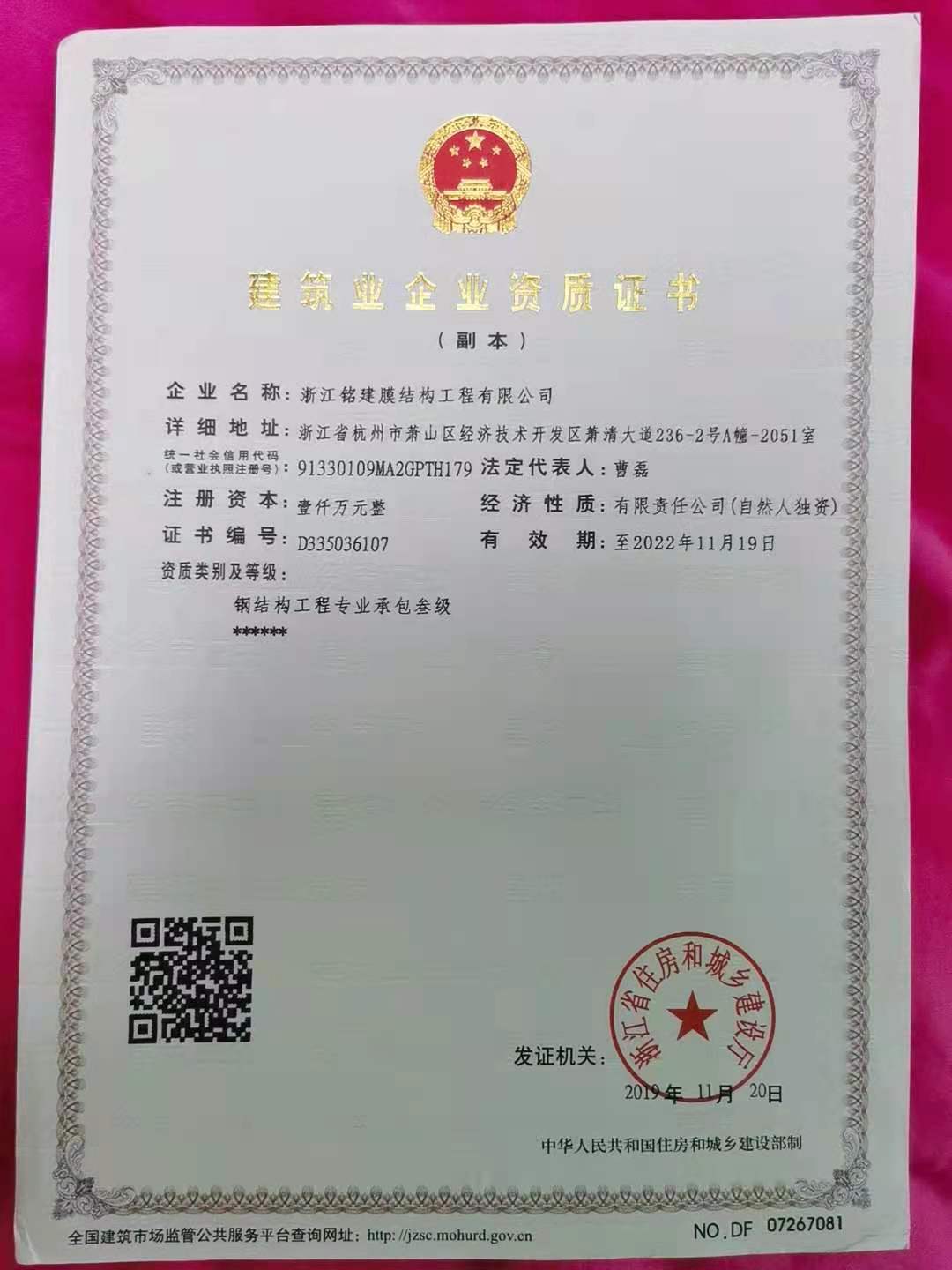 浙江銘建膜結(jié)構(gòu)工程有限公司是一家專業(yè)從事各種鋼膜結(jié)構(gòu)、遮陽工程,設(shè)計(jì)、生產(chǎn)、施工安裝為一體的配套服務(wù)企業(yè),公司主要經(jīng)營范有:鋼結(jié)構(gòu)廠房,膜結(jié)構(gòu)車棚、新能源充電樁、汽車停車棚、電動(dòng)車充電棚、太陽能光伏發(fā)電車棚,景觀棚,伸縮推拉棚,廠房電動(dòng)伸縮棚、公交站臺(tái)、體育看臺(tái),候車亭、停車場(chǎng)小區(qū)汽車出口閘門,張拉膜,手搖棚,移動(dòng)倉庫及各種遮陽設(shè)備;公司實(shí)力雄厚,業(yè)務(wù)范圍廣,承接全國各地的政府機(jī)關(guān)單位,廠區(qū)企業(yè),商場(chǎng)醫(yī)院,廣場(chǎng)小區(qū),學(xué)校體育看臺(tái)等大中小型的鋼、膜結(jié)構(gòu)及遮陽棚工程類業(yè)務(wù),公司有專門的鋼梁膜布加工廠房,專業(yè)的施工團(tuán)隊(duì),承接各種規(guī)格的鋼梁及膜布加工訂單。
